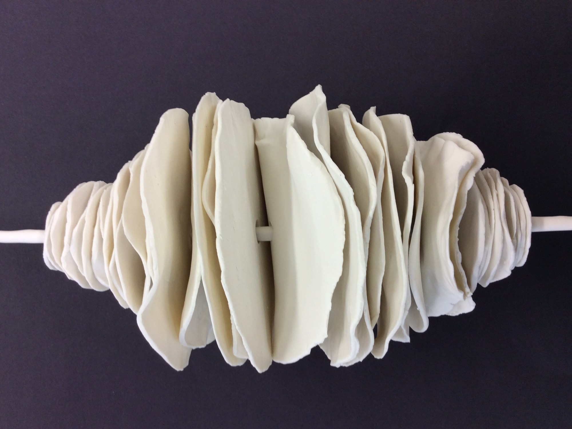The first photograph heading is called Nest. It has developed from our Coursework subject, Utopia, from the book by Thomas More. It comes from a wasp’s nest structure made out of paper but has then been translated into porcelain – the other Name for porcelain being paper clay.. The nest is formed of porcelain rings balanced on a porcelain rod, and although there are 35, of them and they are quite heavy, the rod is strong enough to hold them. They are suspended in a black wooden box – in space. The porcelain makes a bell like sound on the rod if it is moved, which is unexpected and gives it another dimension besides the purely visual.